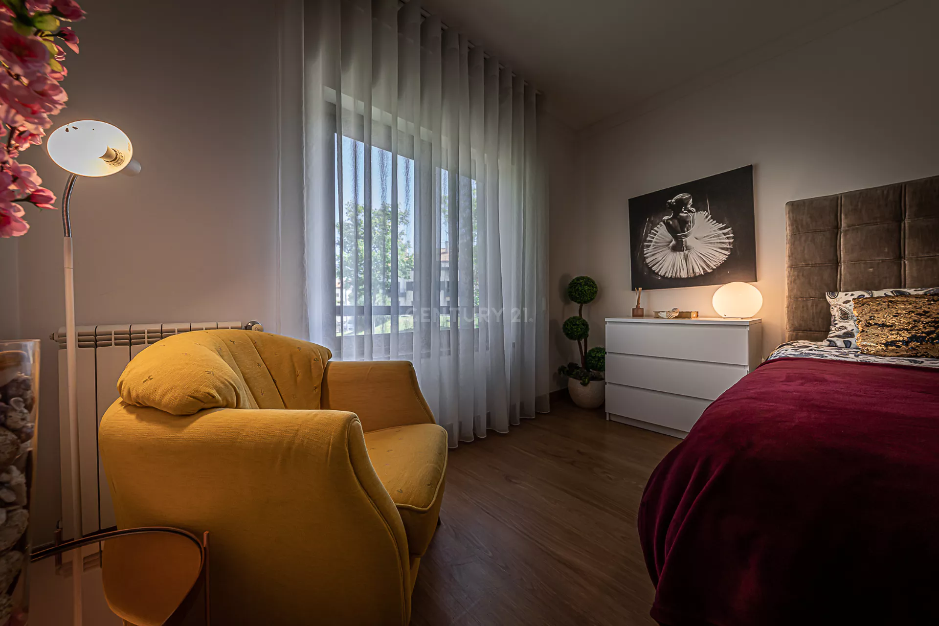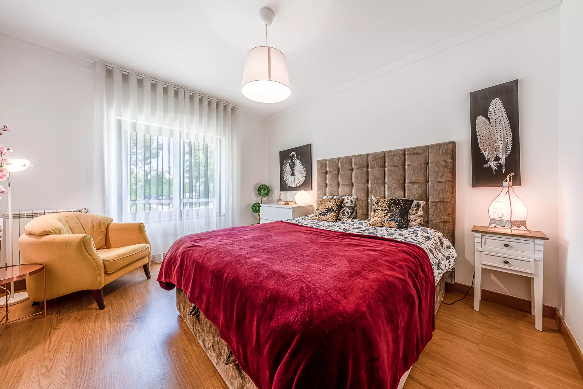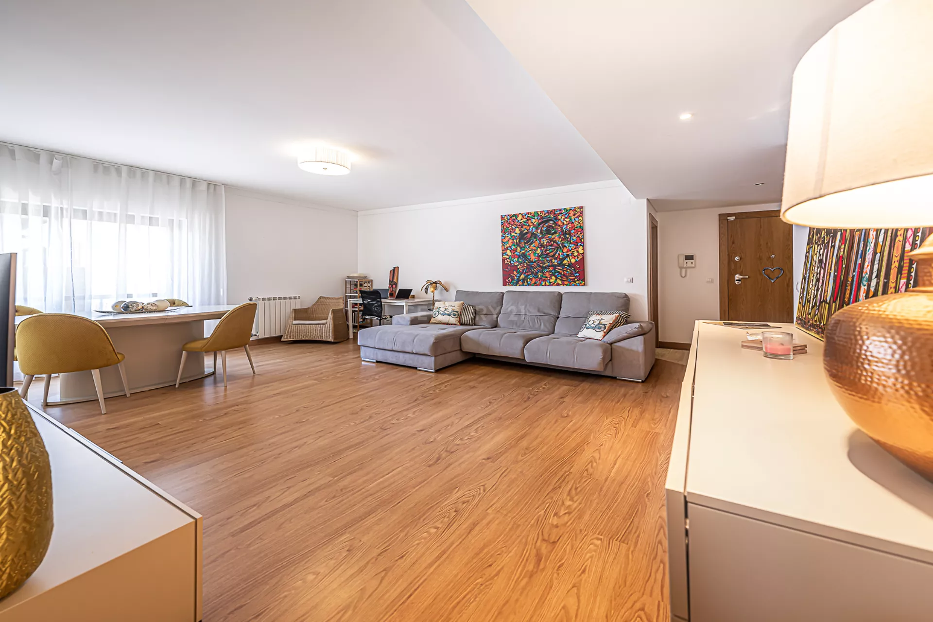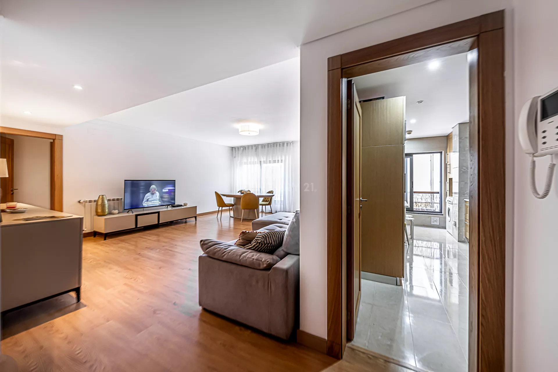 O imóvel é composto por uma ampla sala, cozinha totalmente equipada, um quarto com varanda, um master suite, e mais uma casa de banho.