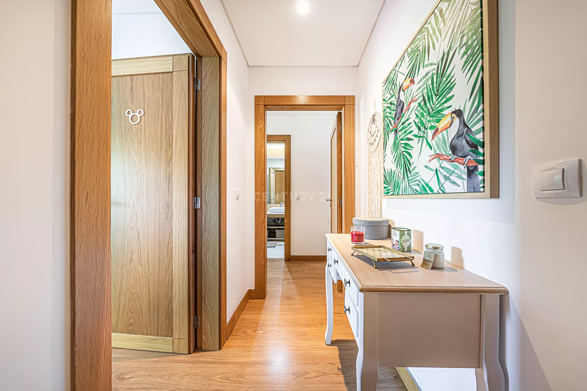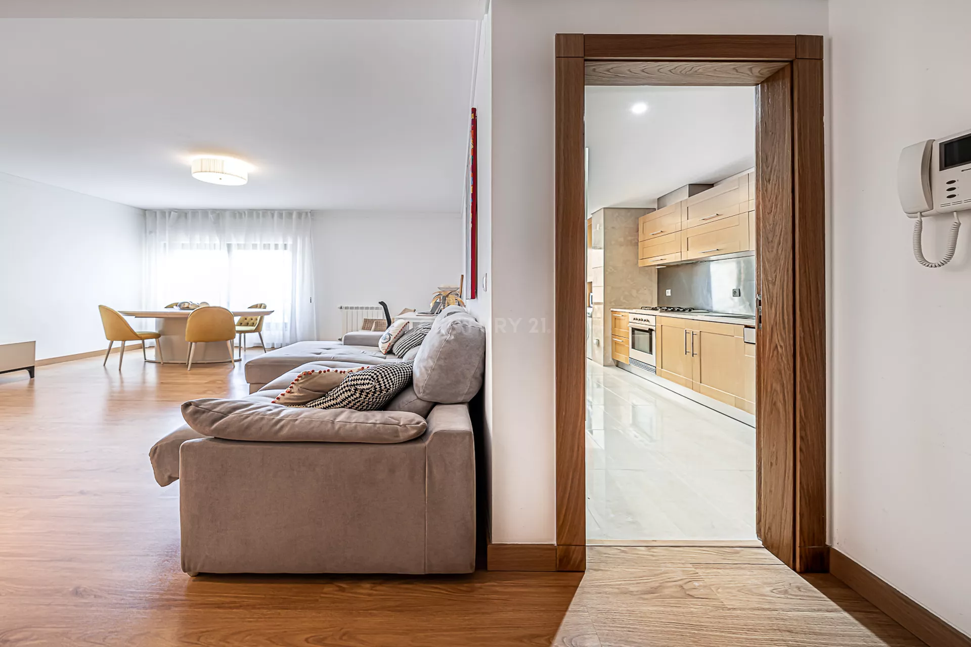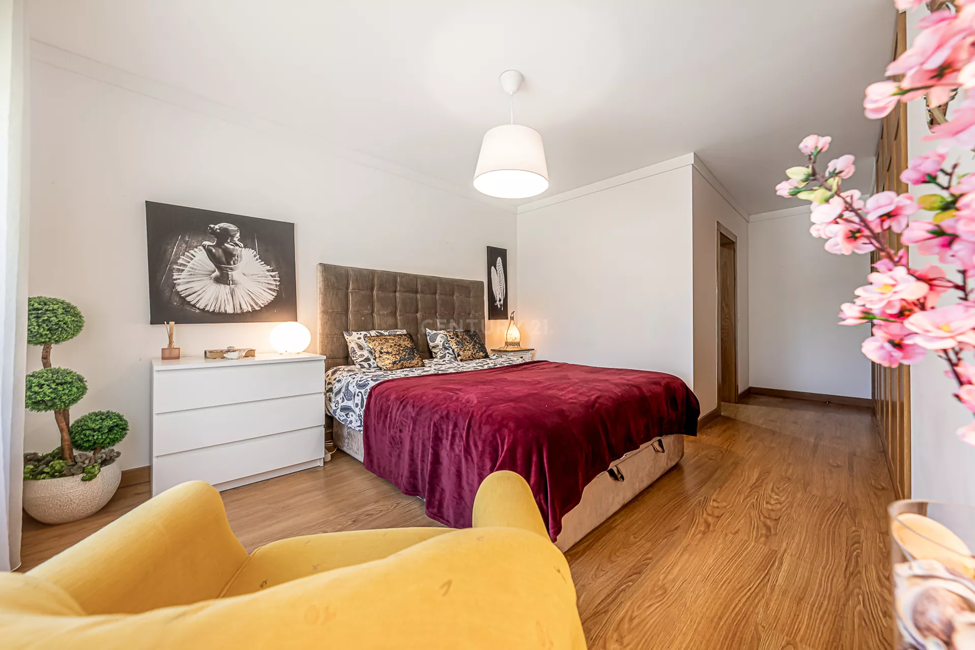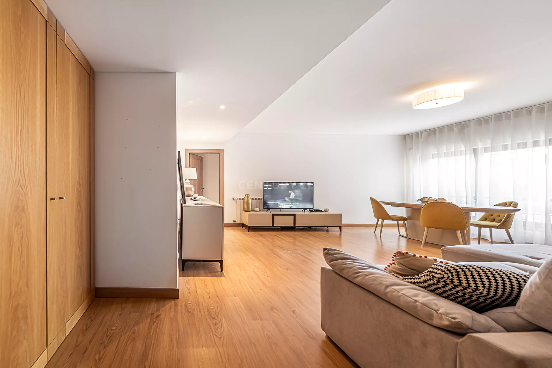 O imóvel é composto por uma ampla sala, cozinha totalmente equipada, um quarto com varanda, um master suite, e mais uma casa de banho.