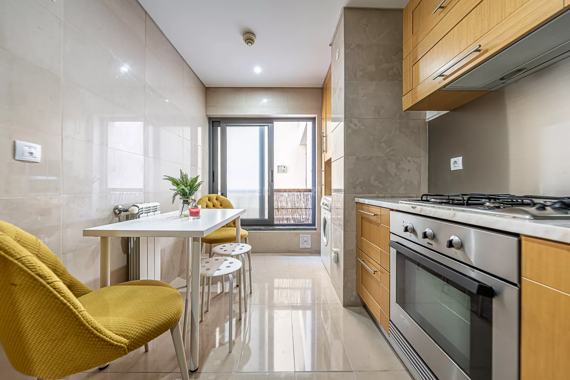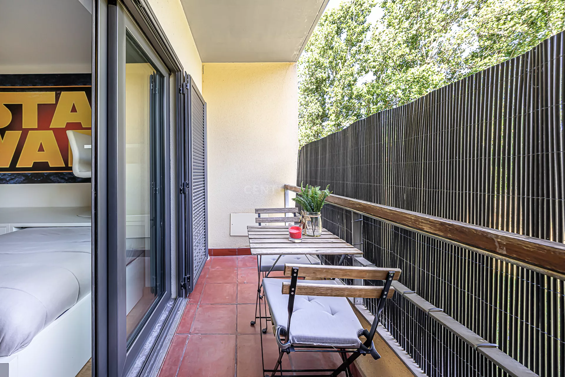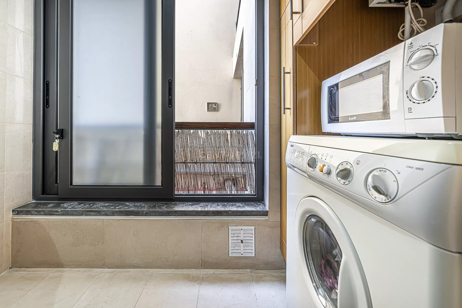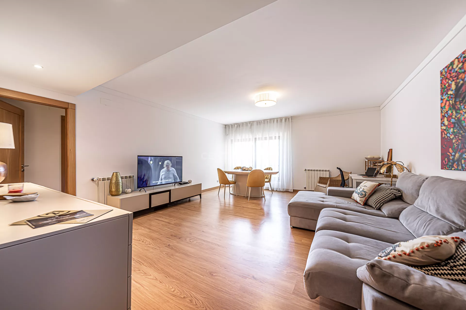 O imóvel é composto por uma ampla sala, cozinha totalmente equipada, um quarto com varanda, um master suite, e mais uma casa de banho.