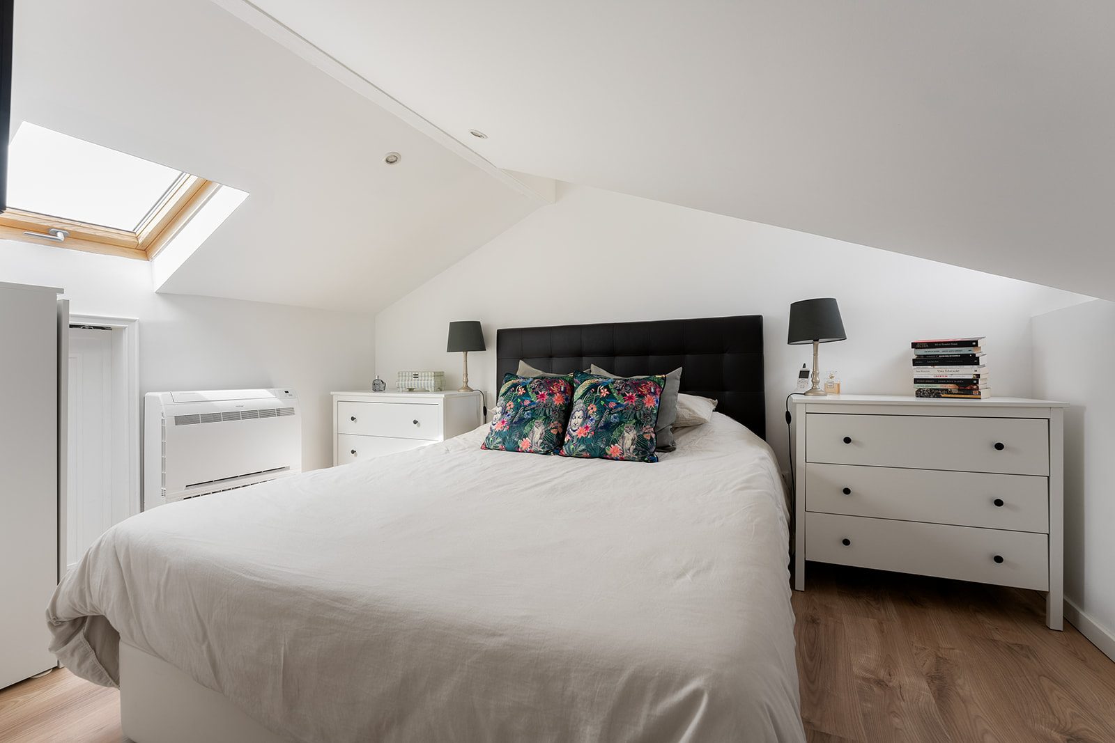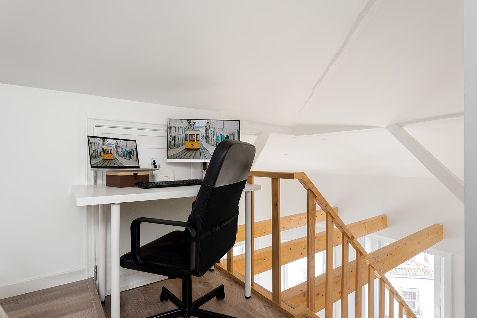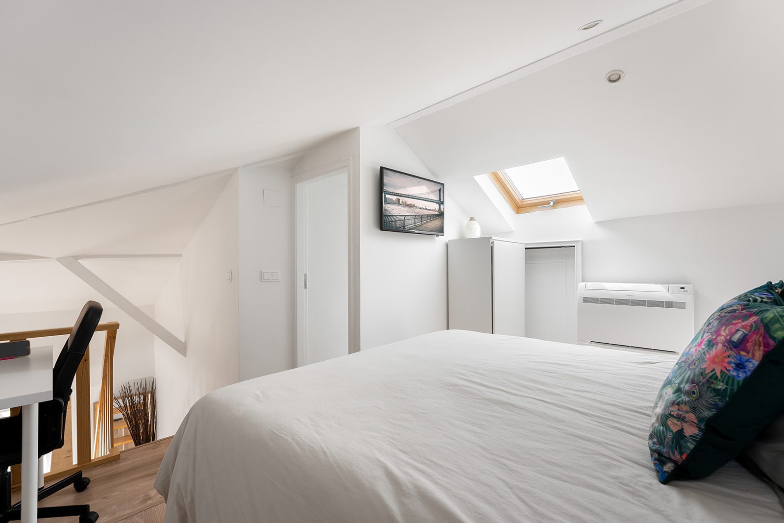 O apartamento é composto por dois pisos. No primeiro piso, encontra-se uma espaçosa sala com dois ambientes distintos – uma área de estar e uma zona de refeições – além de um quarto, uma casa de banho, uma cozinha totalmente equipada e varanda. No piso superior, encontramos outro quarto, uma segunda casa de banho e zonas de arrumos.
