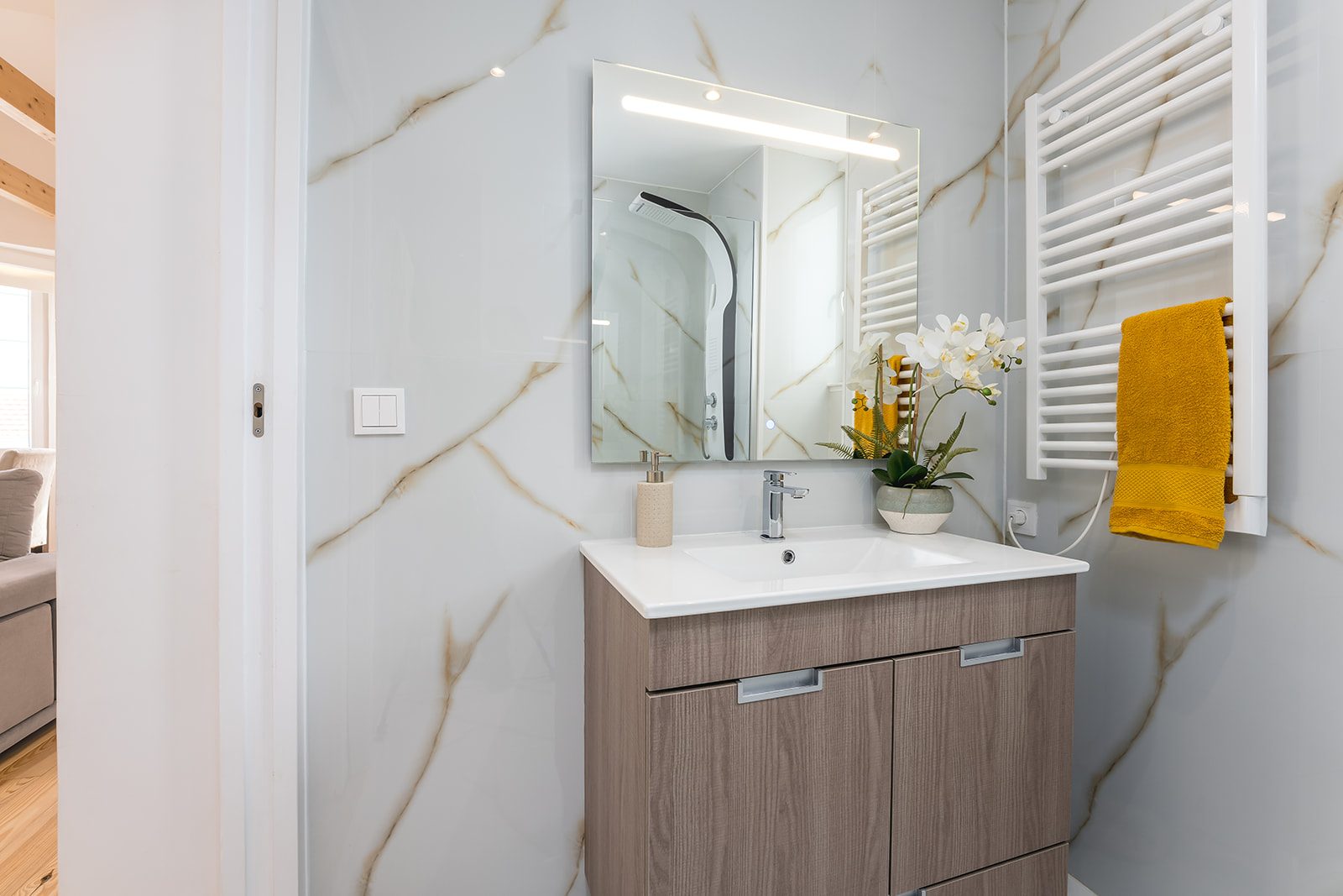 Todas as janelas são oscilo-batentes em PVC, com isolamento térmico e acústico, o que torna este espaço muito confortável. O pavimento em madeira é elegante e durável, enquanto as portas em madeira maciça adicionam um toque de sofisticação. O isolamento com “lã de rocha” tanto nas paredes como no teto e o facto de ser forrado a placas de gesso com cerca de 15cm desviado das paredes antigas, garantem a eficiência energética do imóvel, proporcionando assim um ambiente acolhedor. O apartamento dispõe de ar condicionado em toda a casa, com exceção da cozinha e das casas de banho, resultando num ambiente agradável em todas as estações do ano.