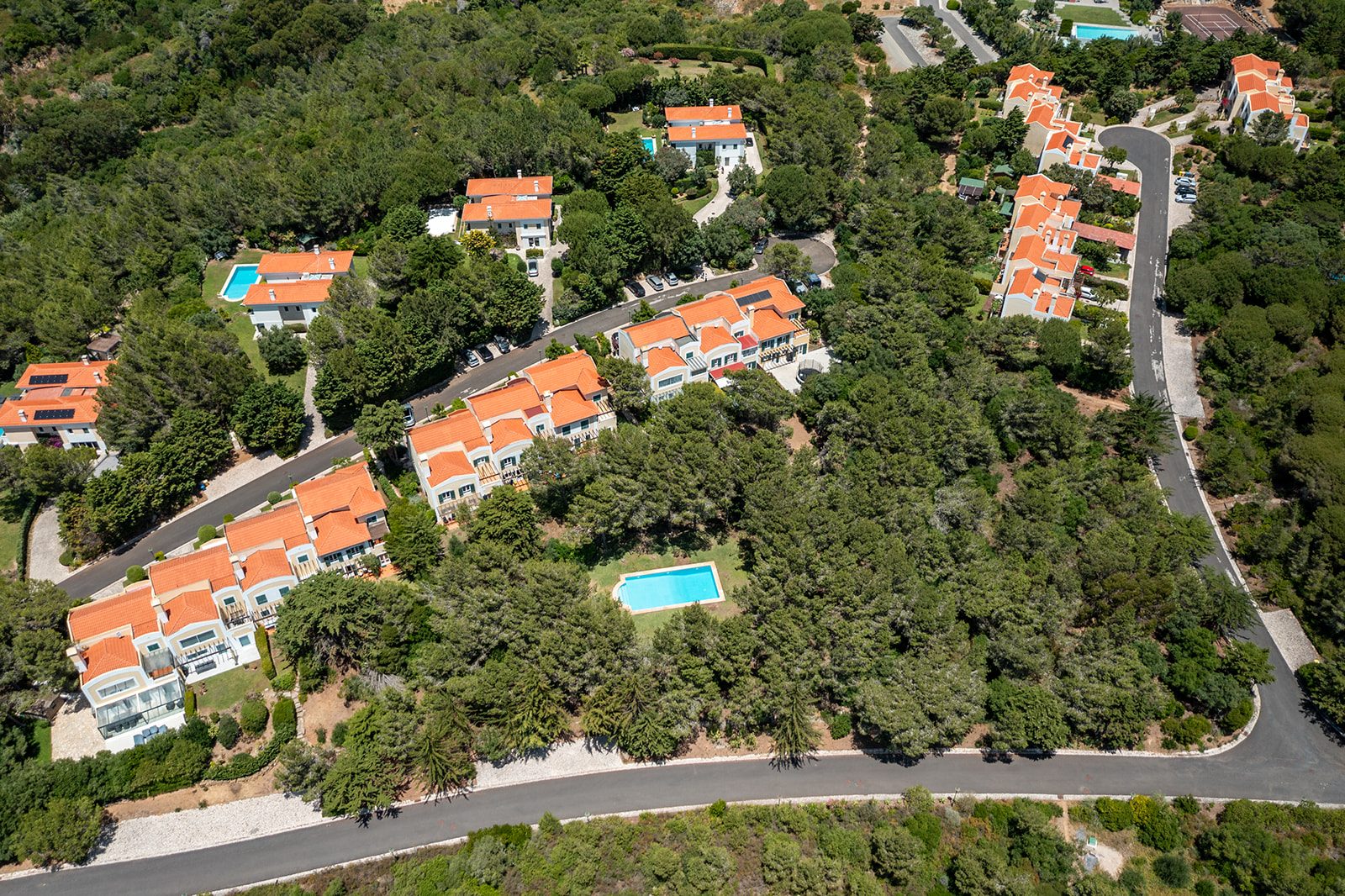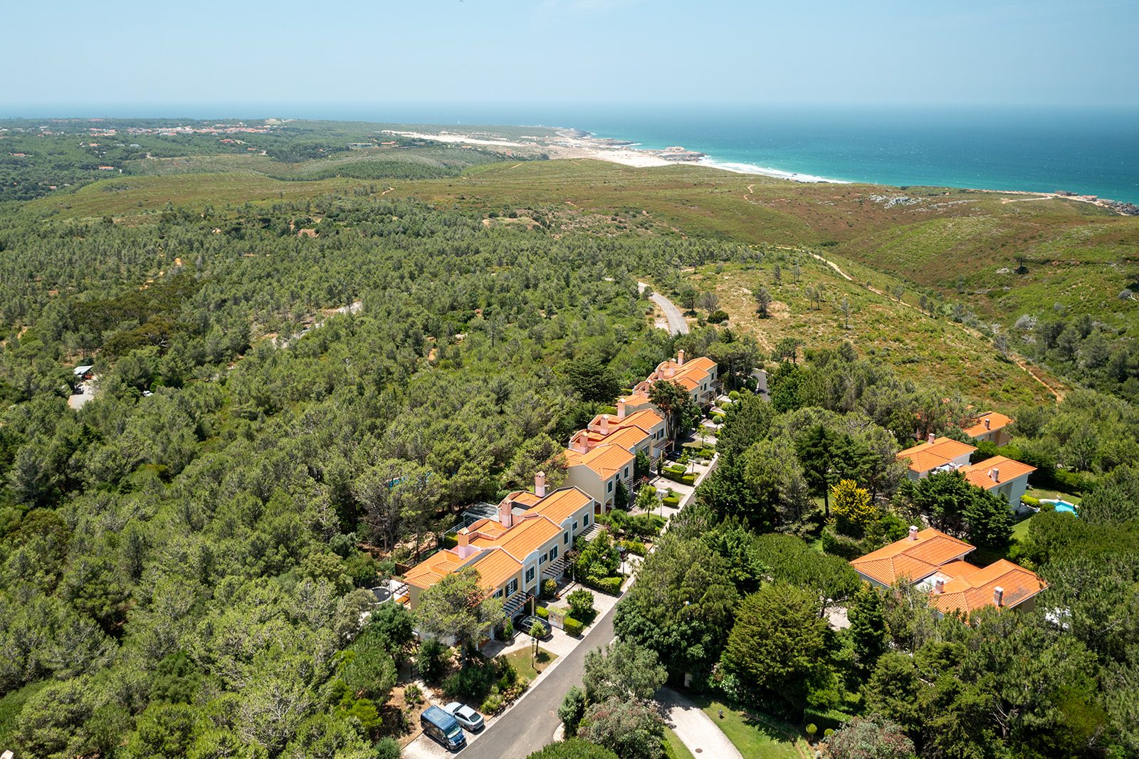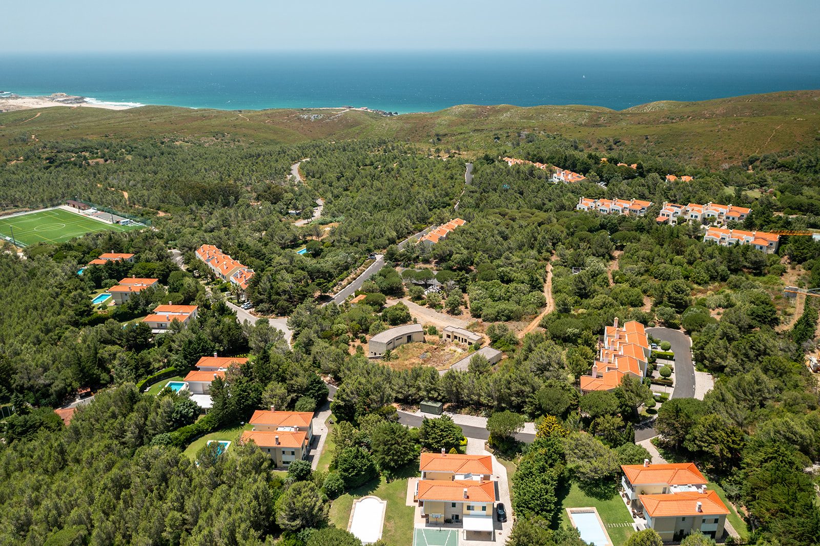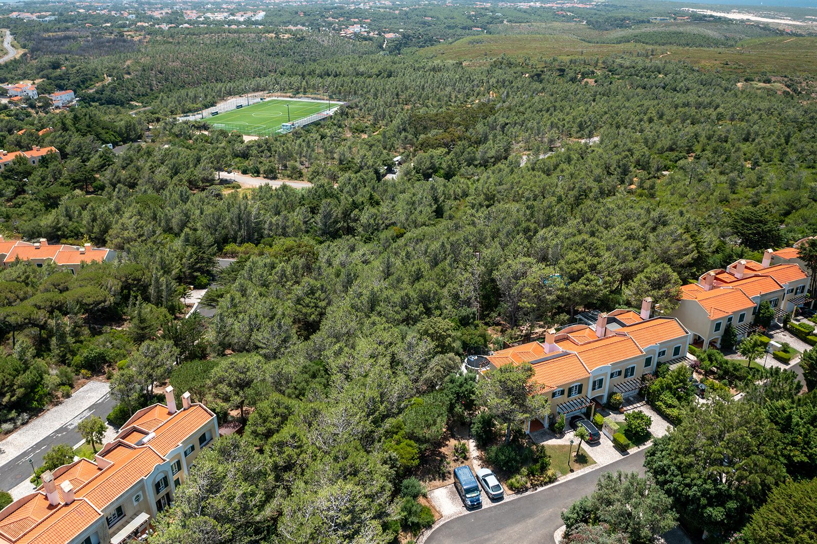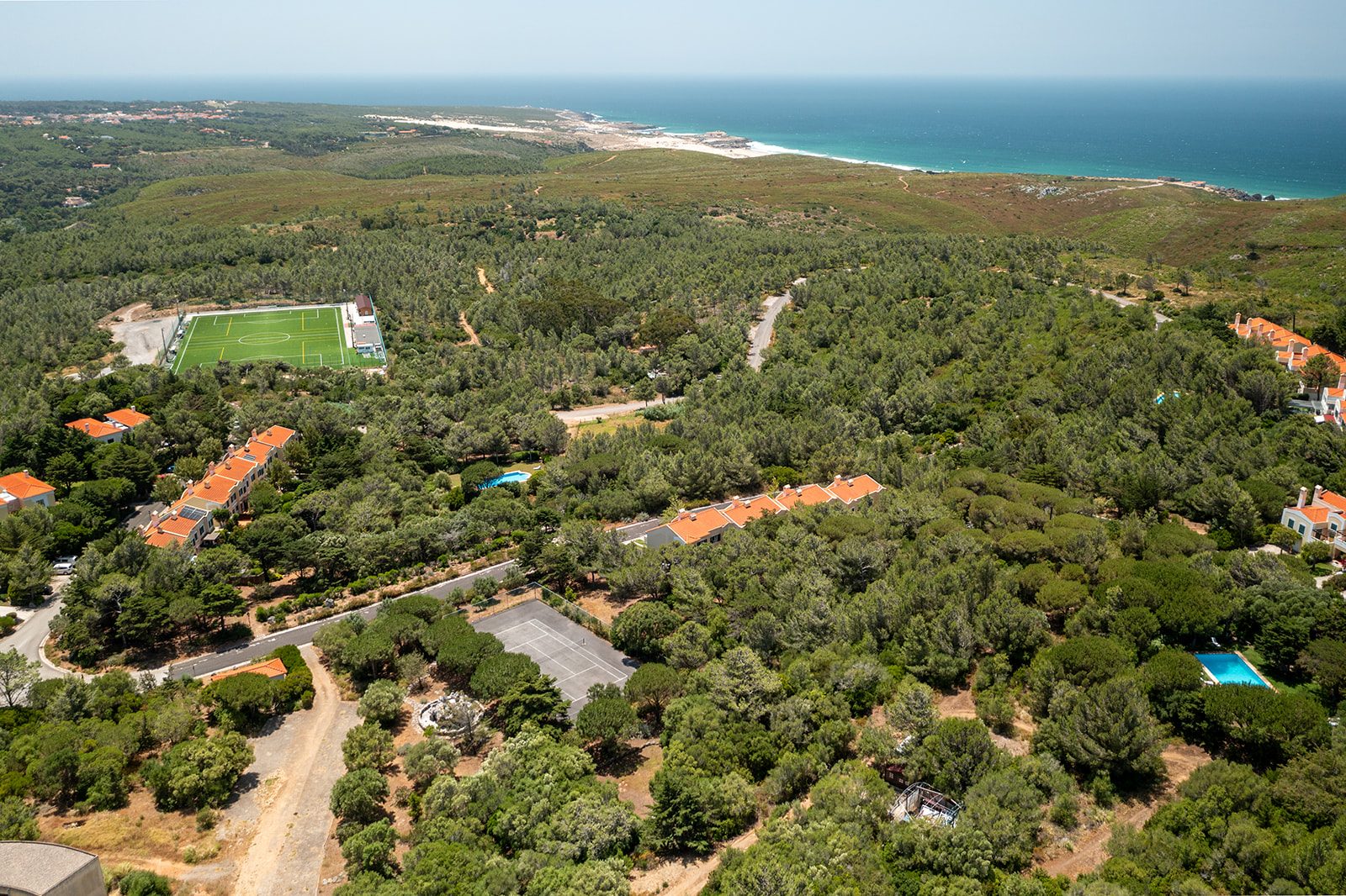 O condomínio oferece ainda um campo de ténis, ideal para momentos de lazer e desporto. Além da beleza natural e do ambiente exclusivo, esta localização é um verdadeiro paraíso gastronómico. A proximidade com a costa do Guincho significa que terá acesso facilitado a alguns dos restaurantes de peixe e marisco mais conceituados de Portugal, como o icónico Furnas do Guincho, o prestigiado Porto Santa Maria, ou o charmoso Maré de José Avillez, onde poderá desfrutar de experiências culinárias inesquecíveis com vistas deslumbrantes sobre o oceano e o sabor autêntico dos produtos frescos do mar. A conveniência estende-se ainda à proximidade de Cascais, com a sua marina, comércio e vida noturna vibrante, e a Sintra, Património Mundial da UNESCO, rica em cultura e história.
