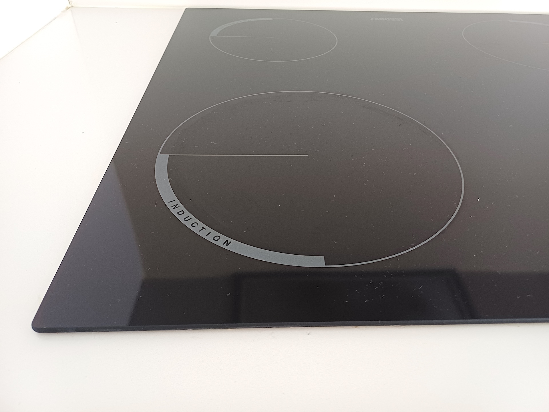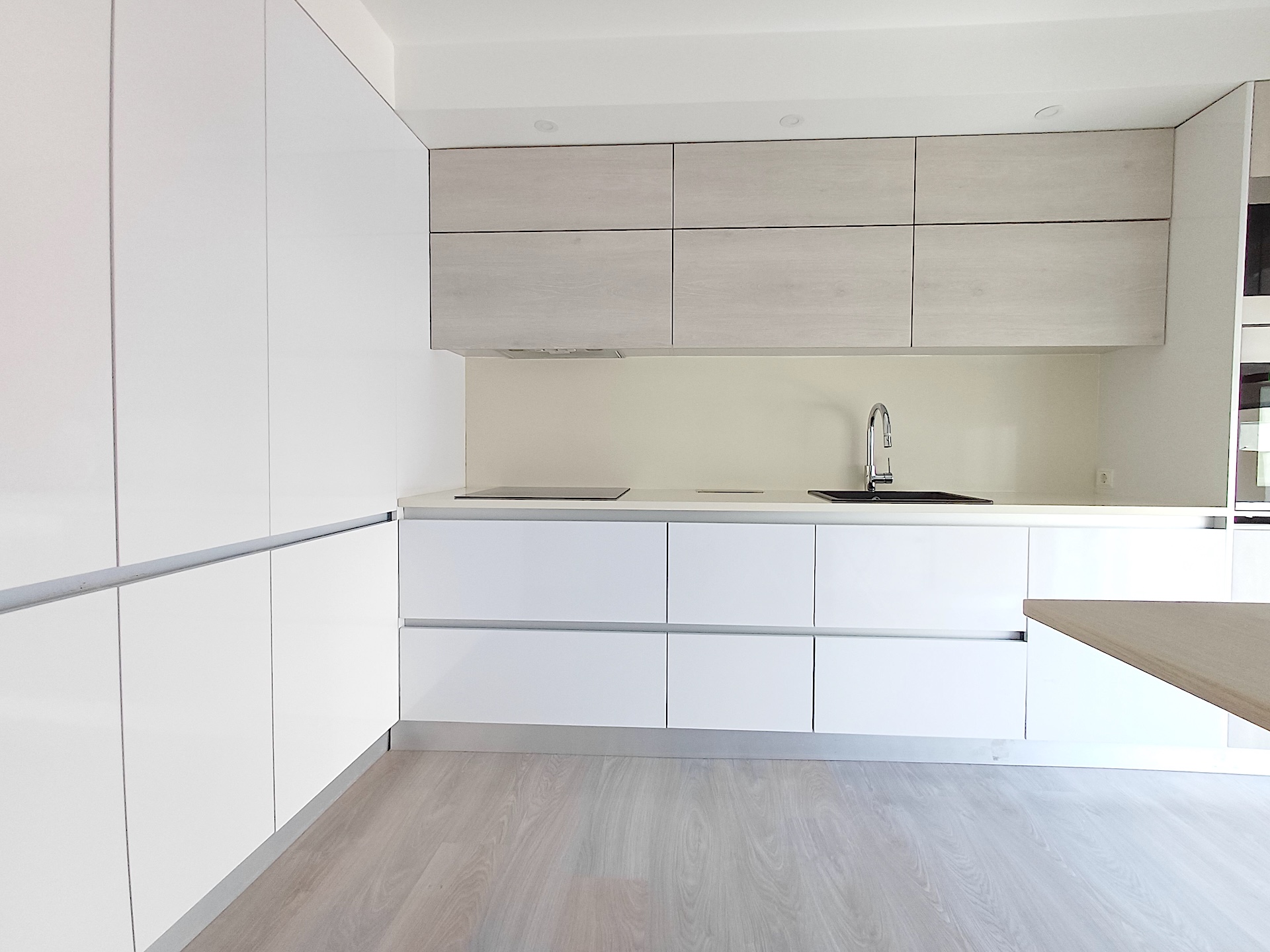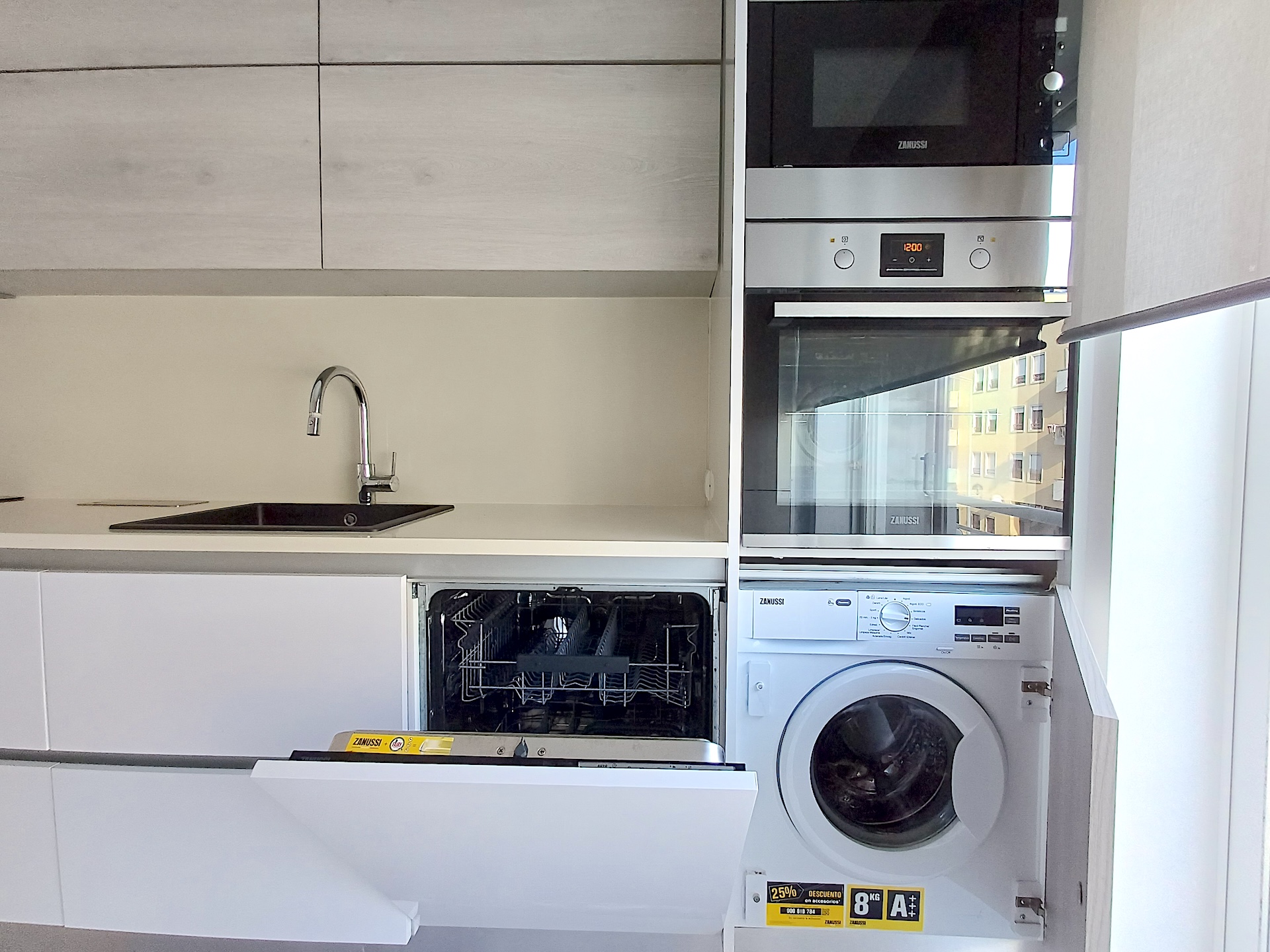 Cozinha moderna com muita arrumação e equipamento de alta gama: forno, placa indução, maquinas de loiça e roupa, frigorífico, microondas, termoacumulador.